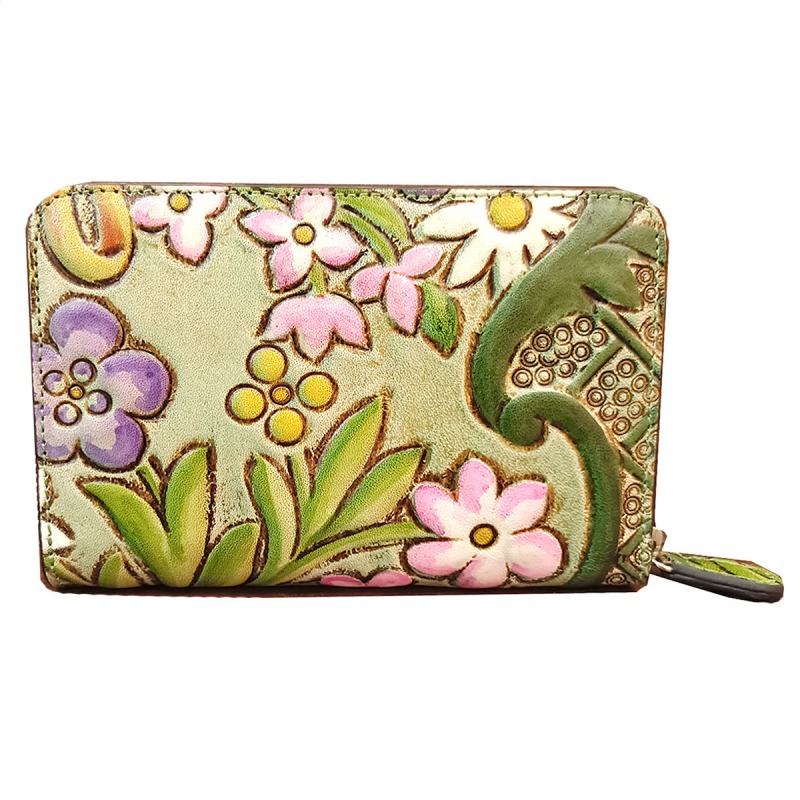 An original leather wallet crafted using the Cordoban technique, inspired by Baroque designs. 17th-century designs inspired by the leathers of Córdoba. It features six compartments for cards, coins, and bills. Dimensions: 10x15cm.